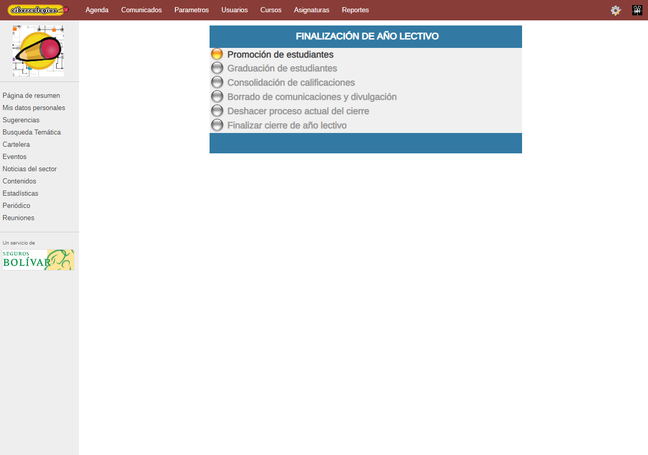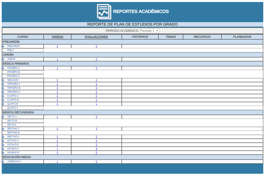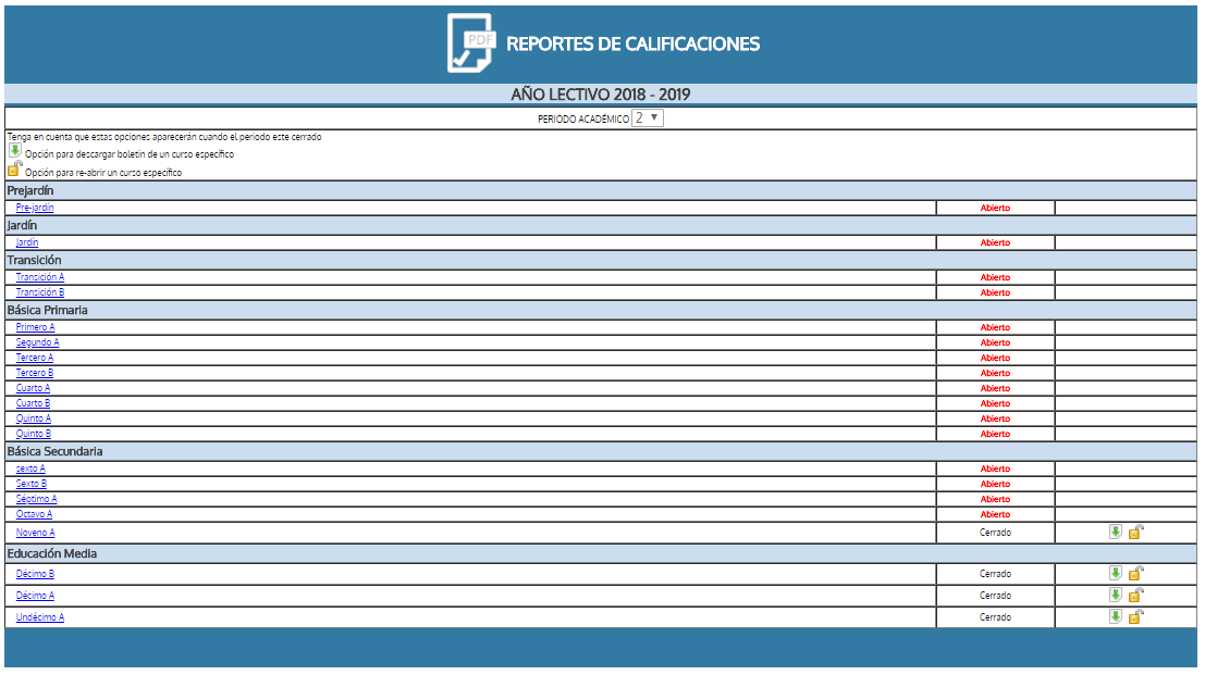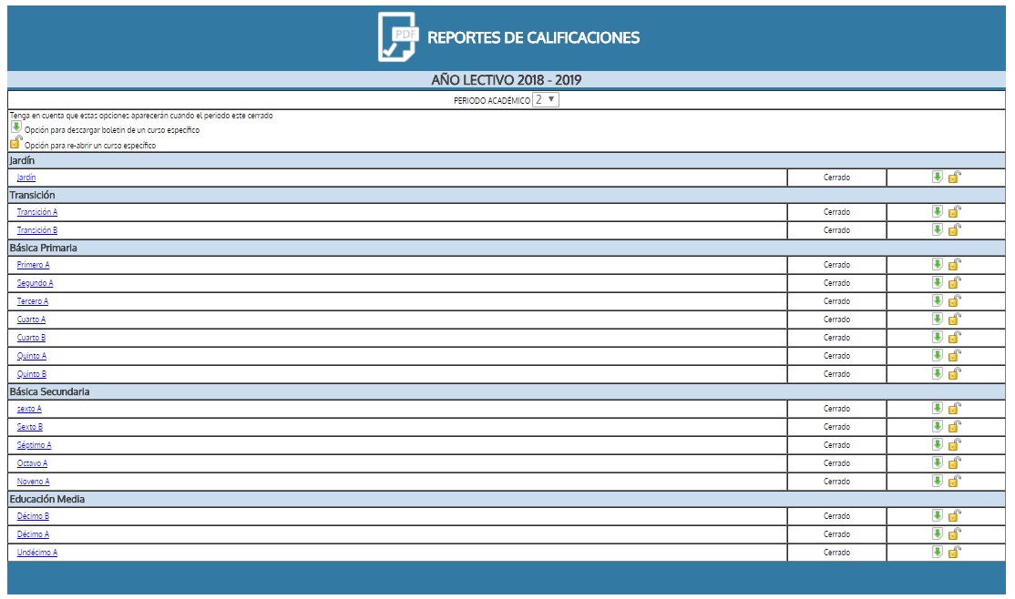 Para cerrar el periodo académico de un curso de la institución educativa o consultar su estado se debe ingresar como Administrador Académico, en la pestaña Reportes, Generación y publicación de informes de calificaciones y seleccionar el periodo a g |