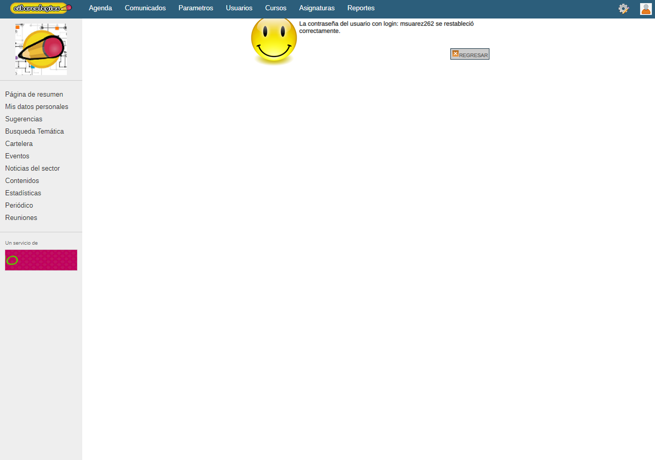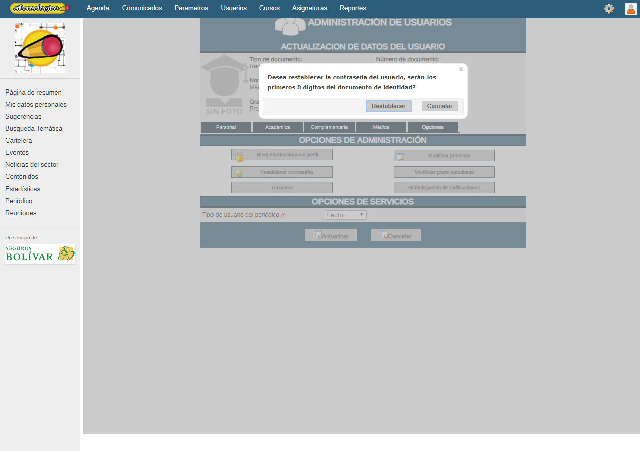 Esta funcionalidad nos permite restablecer la contraseña de los usuarios de la institución que por alguna razón se les olvido o la perdieron lo realiza únicamente el Administrador del sistema de cada Institución. |