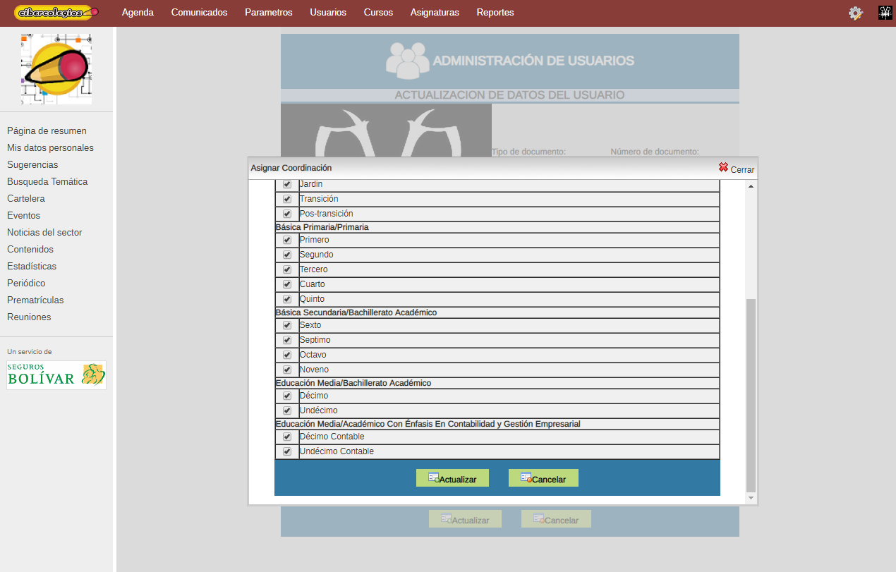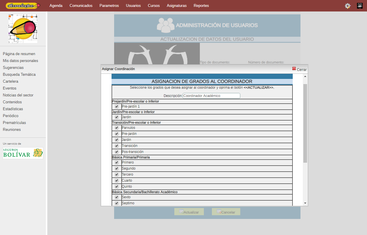 asignacion de cordinacion la cual consiste en asignar los grados a los cuales el coordinador tendrá acceso a la información y envió de información |
