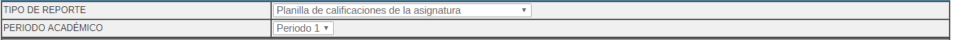 Si el docente al ingresar a la planilla de ingreso de calificaciones a través del perfil de Profesor, Mis Asignaturas, Selecciona la Asignatura, Reportes, Planilla de Calificaciones, Planilla de Ingreso de Calificaciones, selecciona el Periodo Académico |