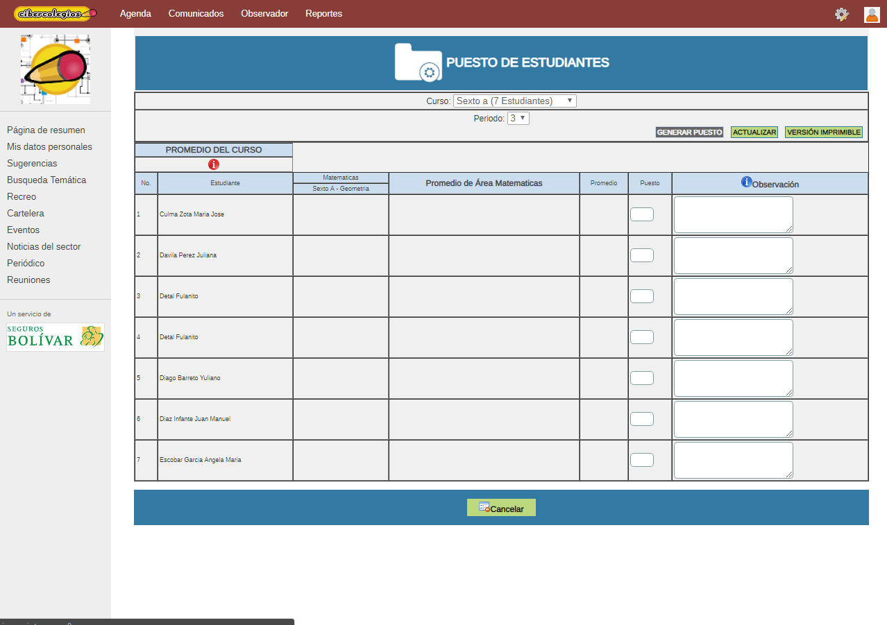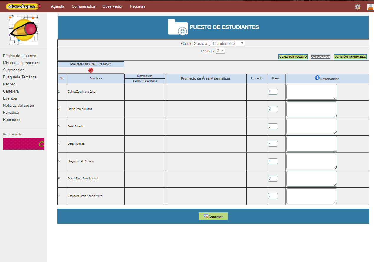 generación de puesto y promedio en la plataforma por el perfil director de curso |